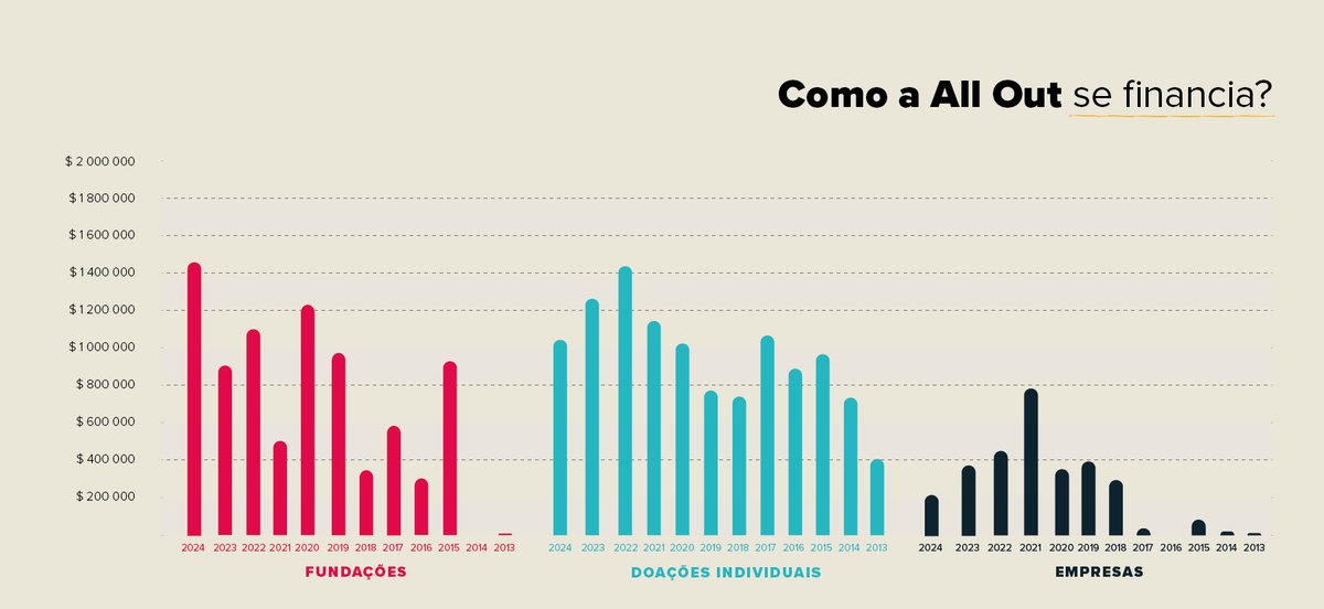 Em 2024, 6,201 doações individuais, com valor médio de US$ 33, formaram 36% de nossa renda. Nosso objetivo é que, no futuro, a All Out seja financiada somente por doações de membros, o que nos daria muito mais independência.